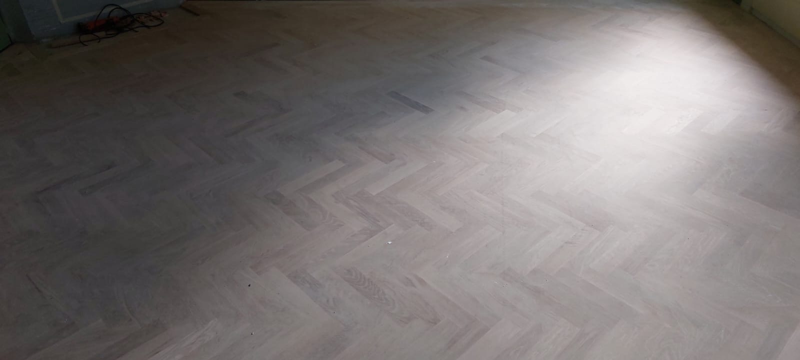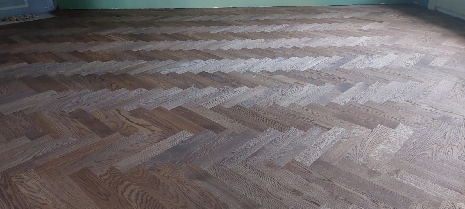 Den første fasen involverte en detaljert sliping av gulvet, der vi fjernet gammel overflatebehandling og jevnet ut gulvet til perfeksjon, og la det naturlige mønsteret av fiskebein komme til sin rett.